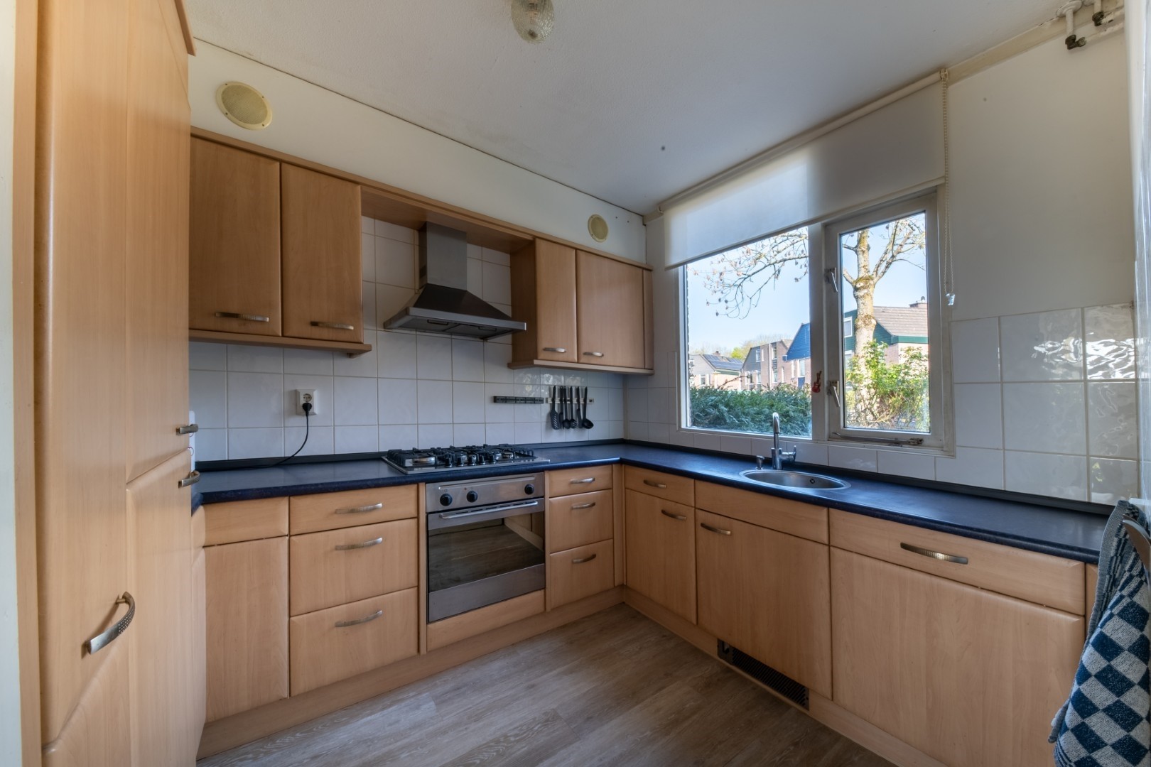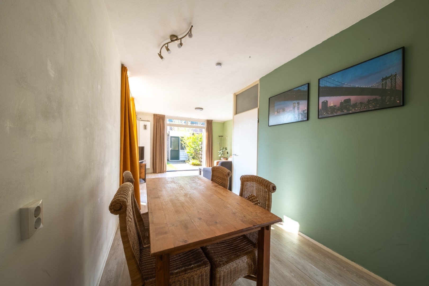 Aan de voorzijde bevindt zich de half open keuken, die op een natuurlijke manier in verbinding staat met de woonkamer. Vanuit hier heb je zicht op het pleintje, wat zorgt voor een levendig maar toch rustig straatbeeld. De opstelling biedt een goede basis en de ruimte om de keuken geheel naar eigen wens en stijl in te richten.