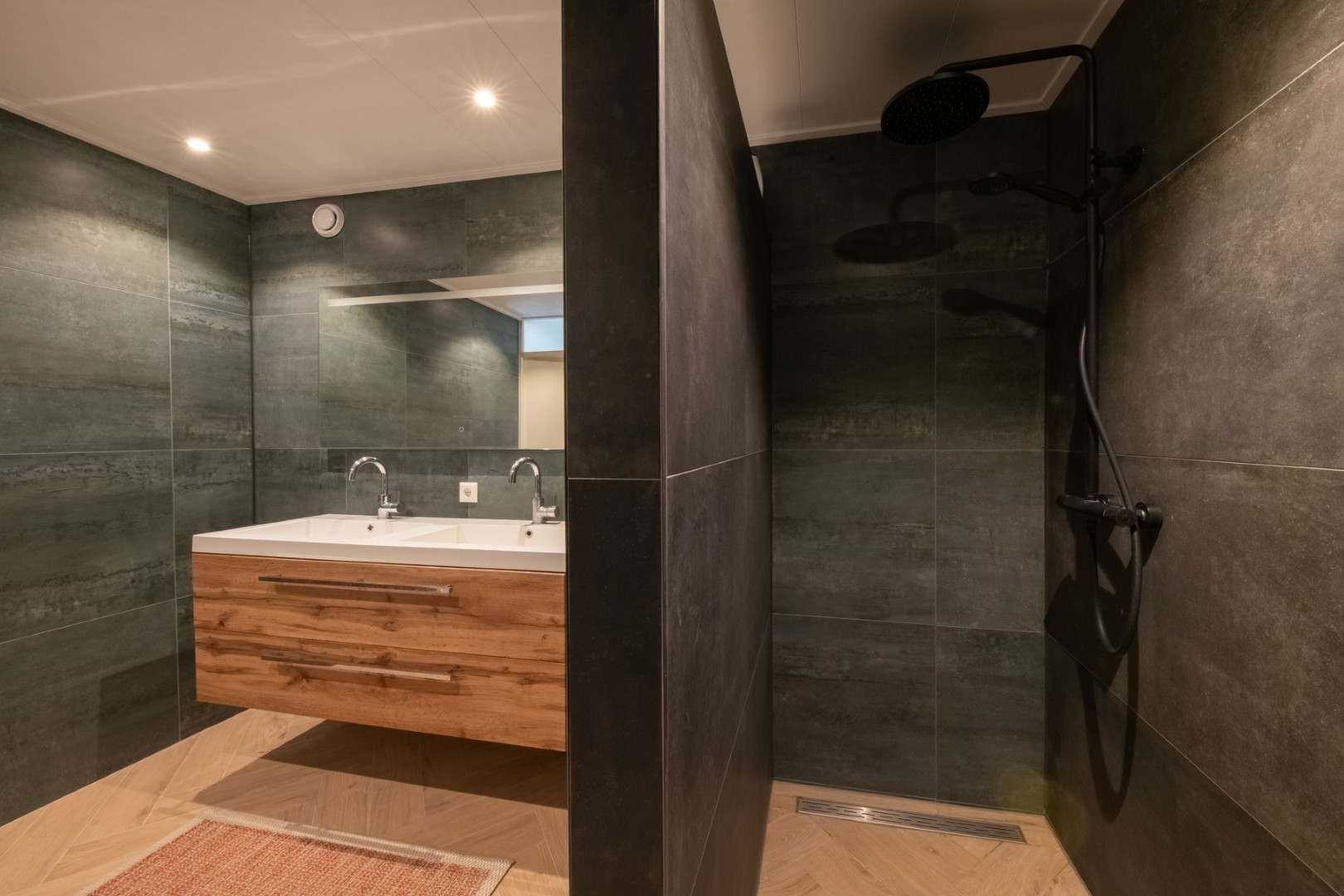 De badkamer is royaal en eigentijds uitgevoerd en beschikt over een dubbele wastafelmeubel, een tweede toilet en een ruime inloopdouche. Een verzorgde en comfortabele ruimte die aansluit bij de woonwensen van nu.