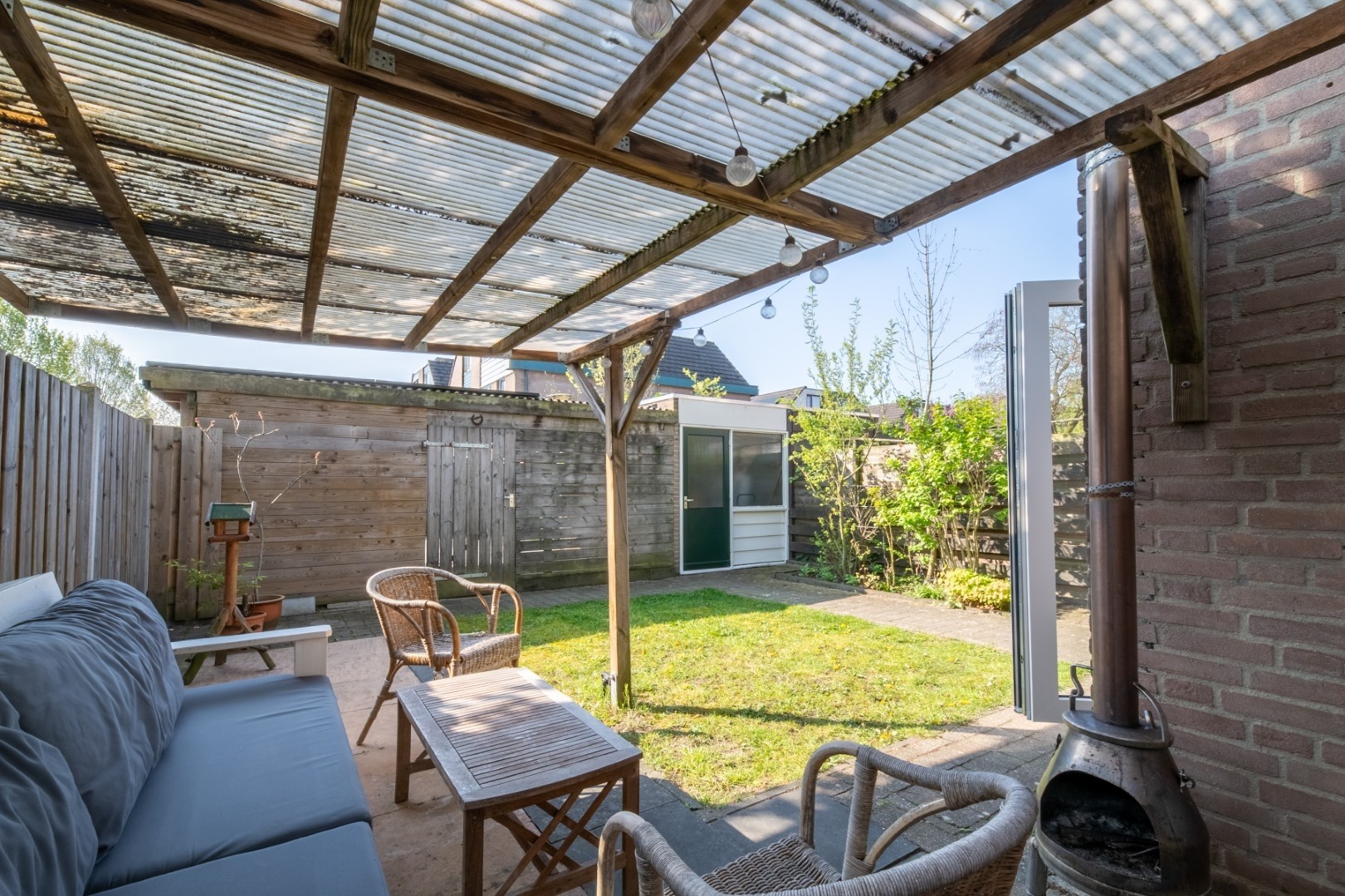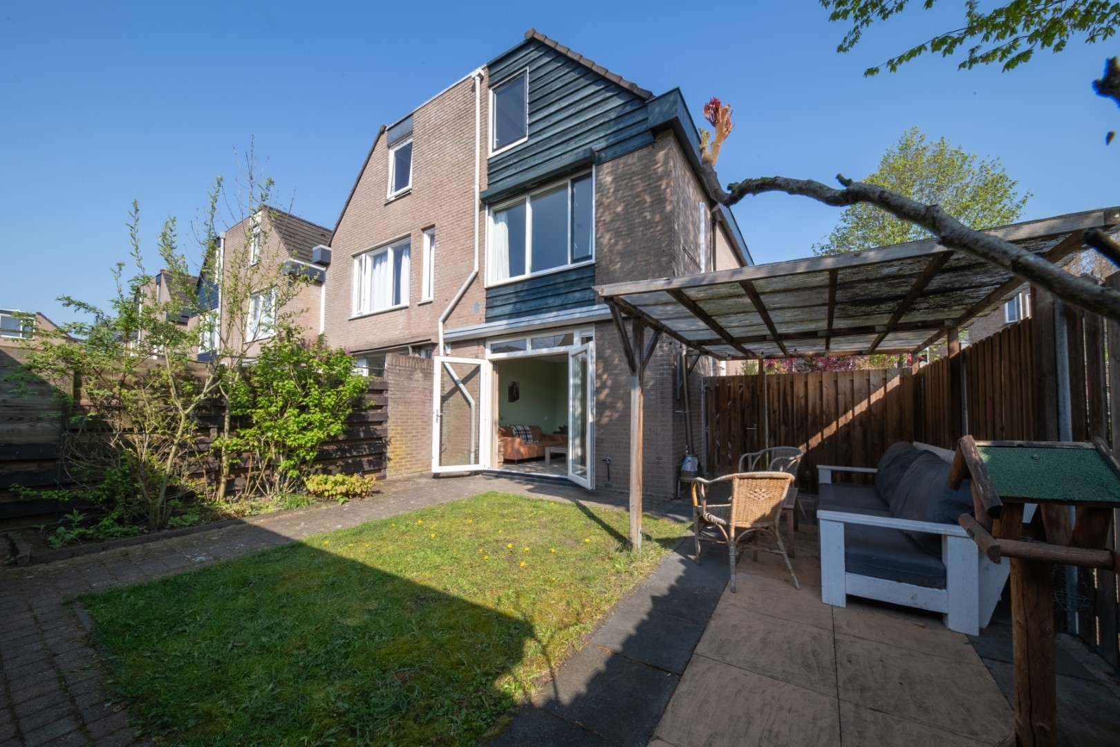• Zonnige achtertuin met overkapping