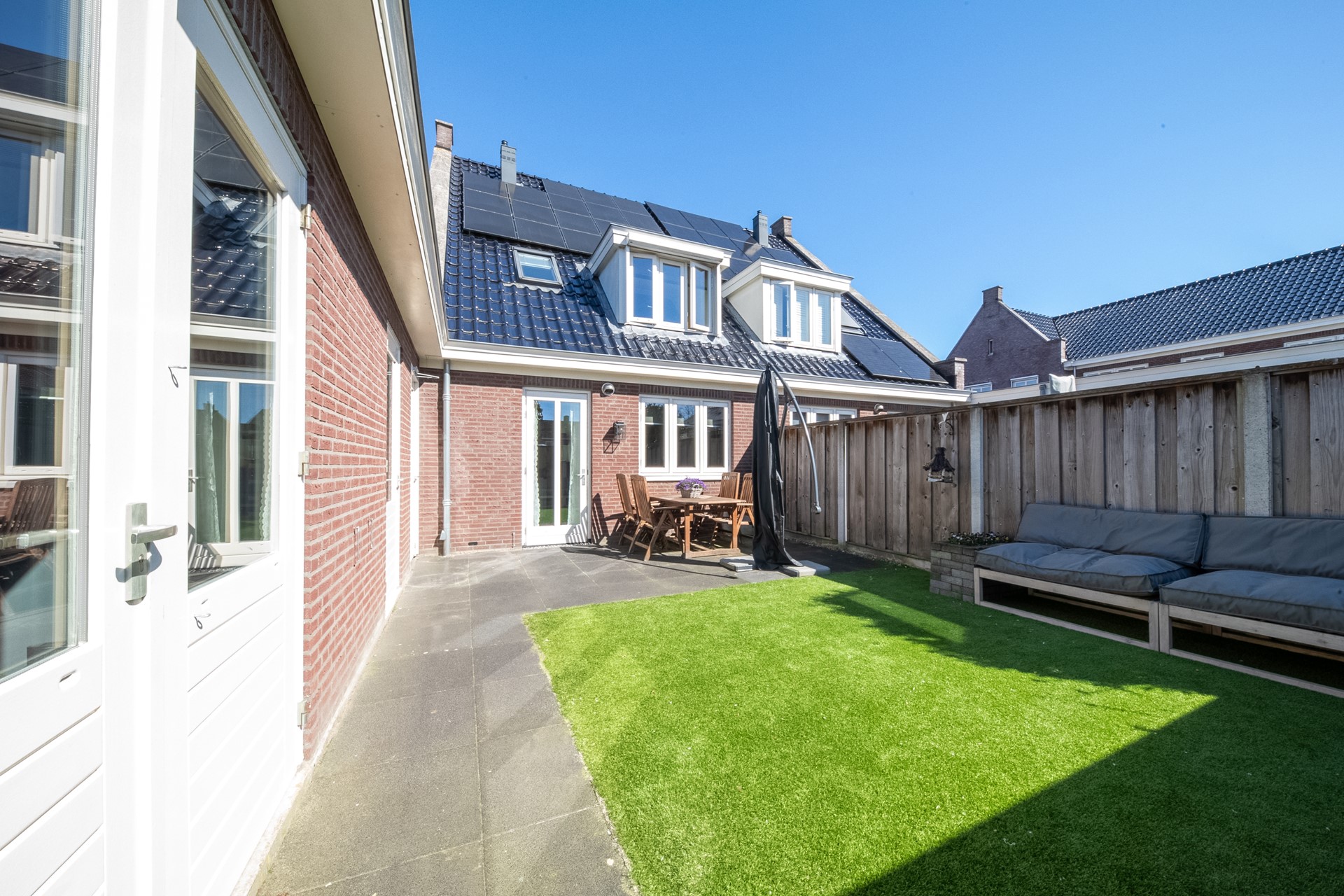 Aan de achterzijde van de woning ligt een zonnige tuin op het zuiden. De tuin is via een achterom toegankelijk en onderhoudsarm aangelegd met bestrating en kunstgras, waardoor deze weinig onderhoud vraagt.