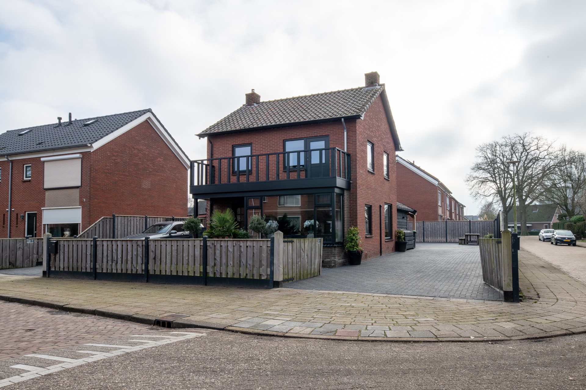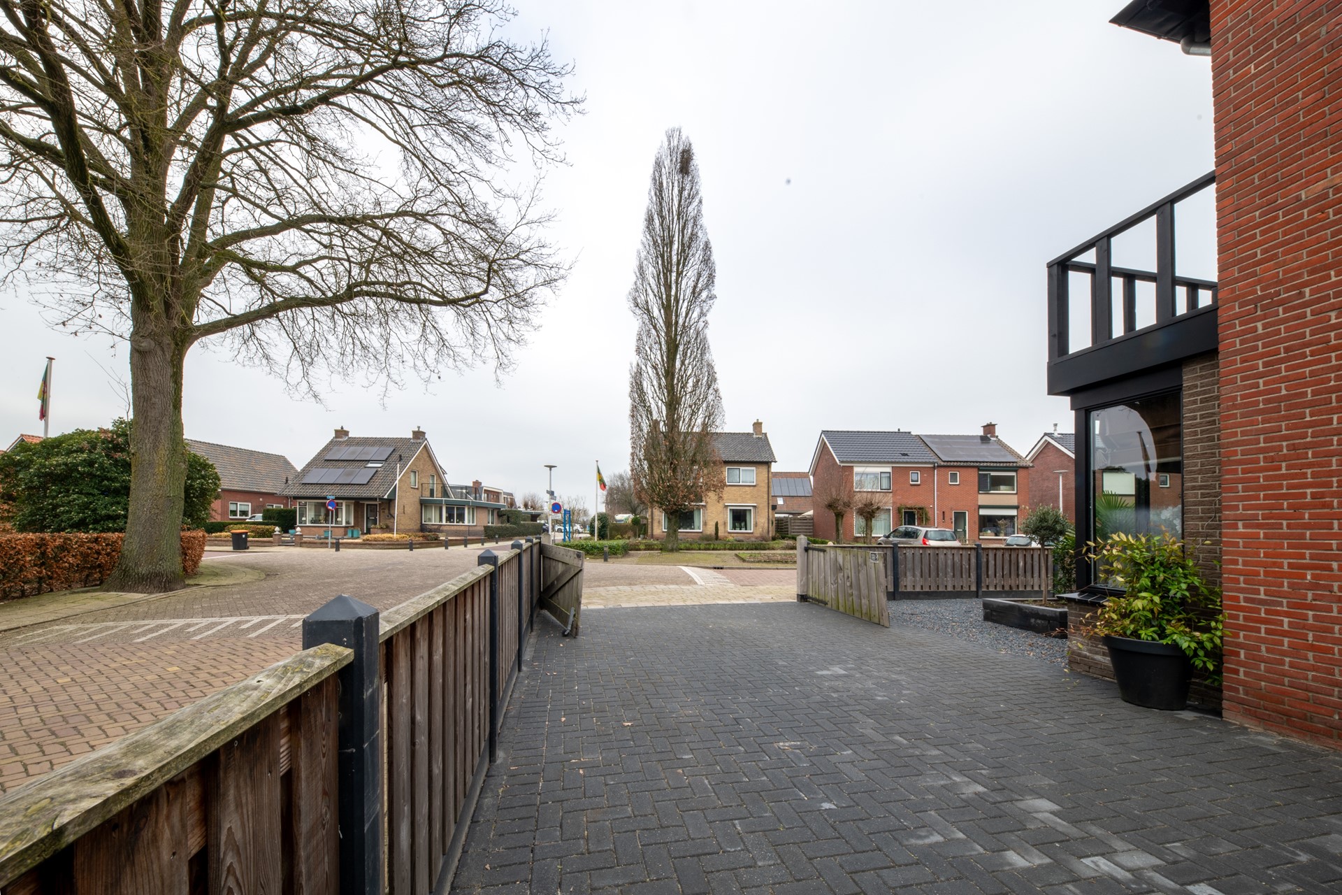De rondom gelegen tuin is onderhoudsvriendelijk aangelegd en grotendeels verhard, wat zorgt voor een verzorgde uitstraling en optimaal gebruiksgemak. Aan beide zijden van de woning bevindt zich een oprit: de linkerzijde biedt toegang tot de entree van de woning, terwijl de rechterzijde doorgang geeft naar de achtertuin.