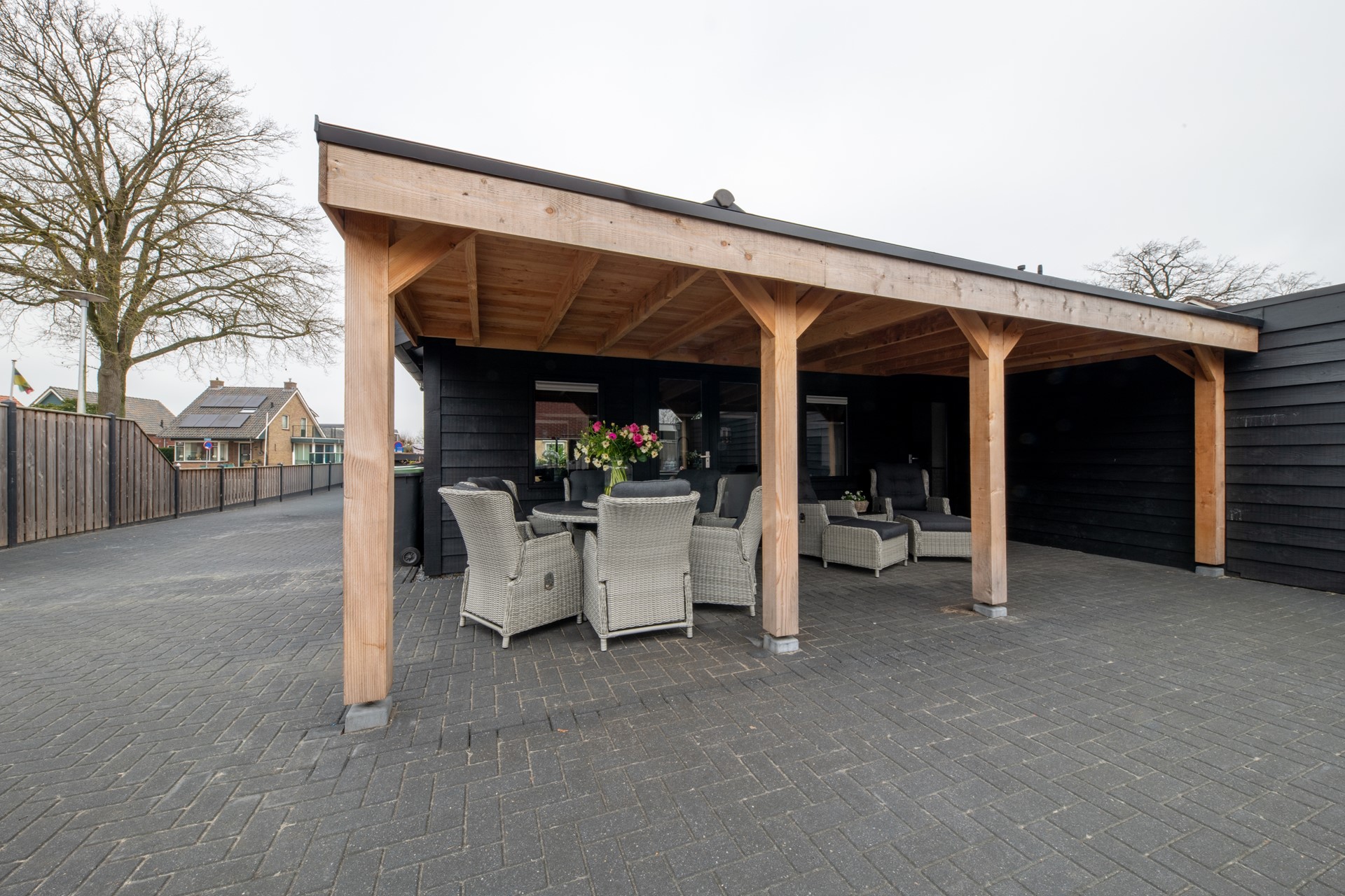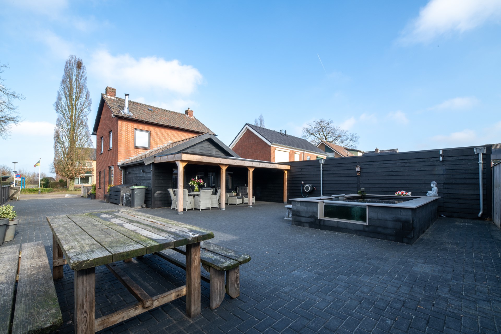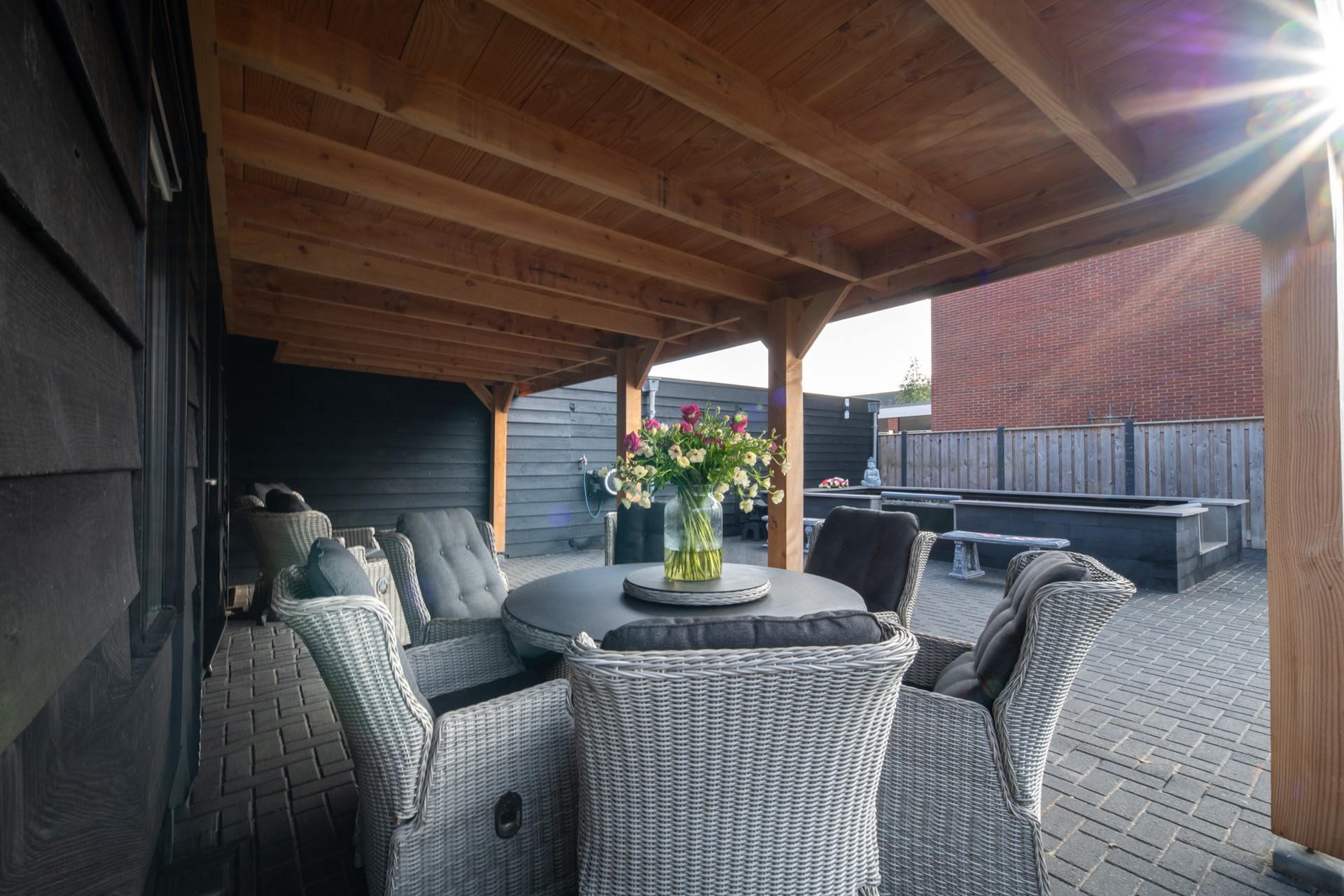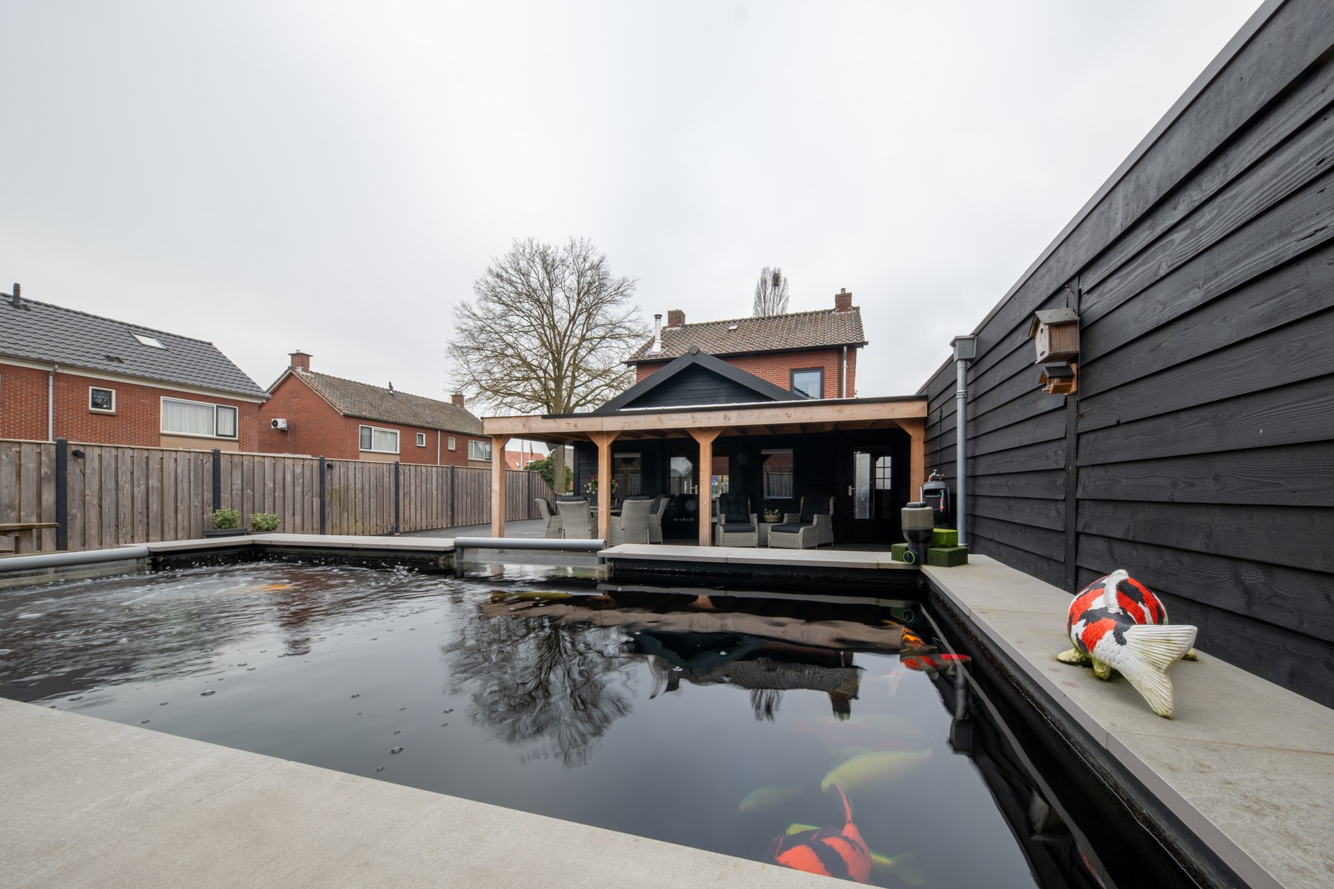 Direct grenzend aan de keuken is een overkapping gerealiseerd – een heerlijke plek om beschut te genieten van het buitenleven, van ’s ochtends vroeg tot ’s avonds laat. Achter in de tuin bevindt zich een sfeervolle vijver, die zorgt voor een rustgevende ambiance en een vleugje natuurlijke charme.